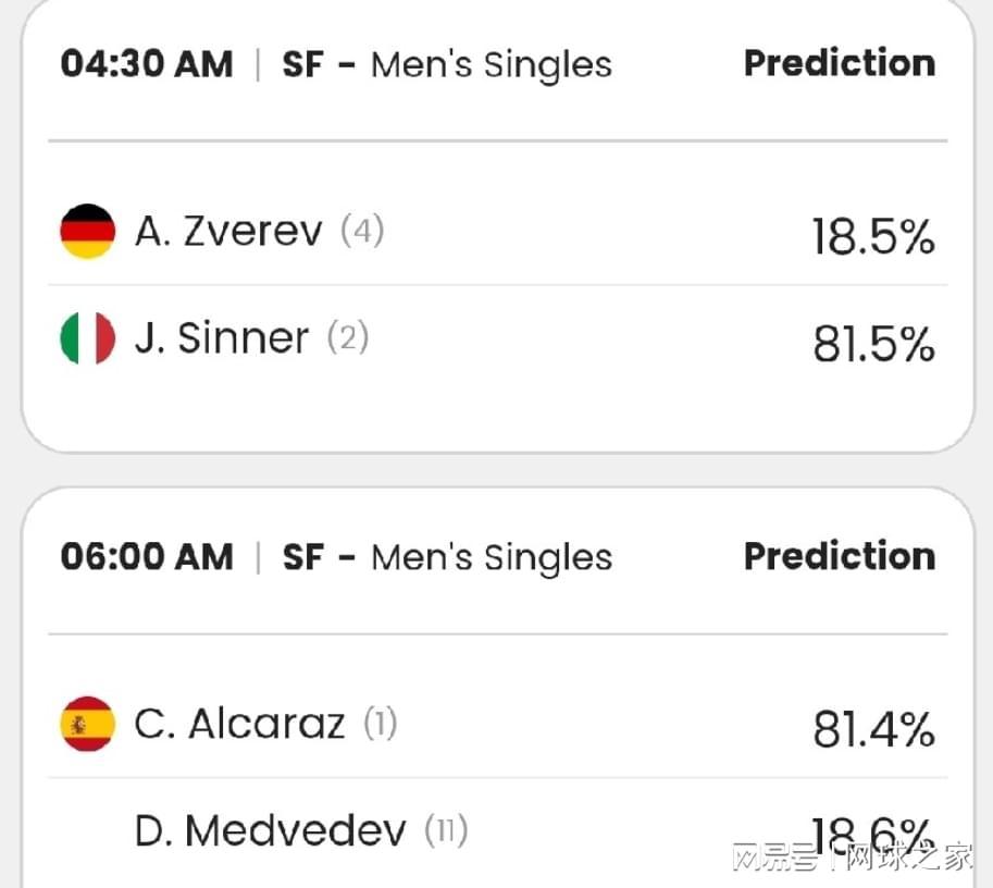 辛纳的81.5%和小兹维列夫的18.5%获胜概率,以及阿尔卡拉斯的81.4%和梅德韦杰夫的18.6%支持率,这种绝对的碾压程度,都给人一种无比扎心的感觉。