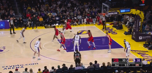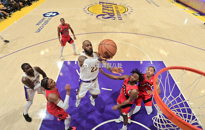 首节比赛中,詹姆斯手感并不好,他仅有一次长两分命中,单节3中1得到2分。进入次节比赛后,詹姆斯开始火力全开,他连续中投得手,此外持续冲击猛龙队篮下得手,一人独得11分带领湖人队打出进攻高潮,在上半场结束的时候保持一分的领先。